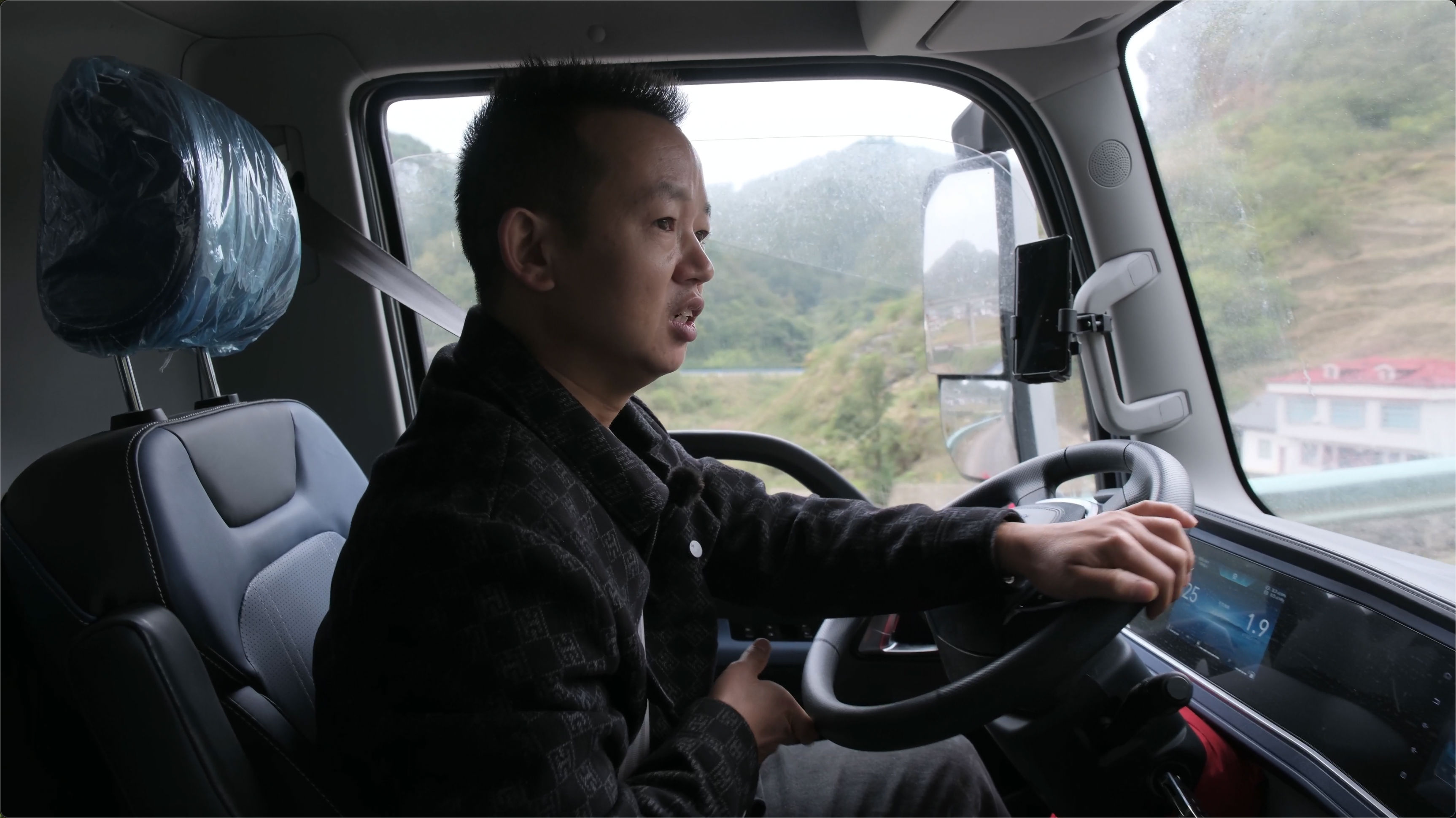 随着车辆翻越一座山头,随之也迎来另一个挑战,就是连续的长距离下坡,“都说爬坡容易下坡难,像我们这种重载的货车下坡更是危险。” 说着周师傅打开了车上的淋水器开关,他介绍道:“这款车是气刹的,而且我们也改了淋水,基本上是这边山区跑重载的标配,安全是放在第一位的,而且像这辆车淋水改在底盘就行,不仅方便车子跑起来也更稳。”