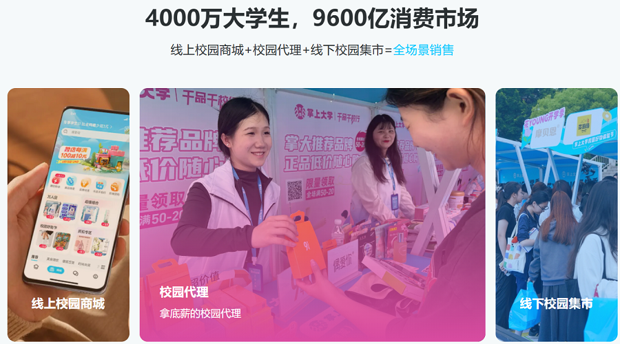 在校园内,掌上大学已形成了"线上商城+校园代理+线下路演"的全场景模式。 而商圈路演的引入,使这一模式拥有了更广阔的应用场景。