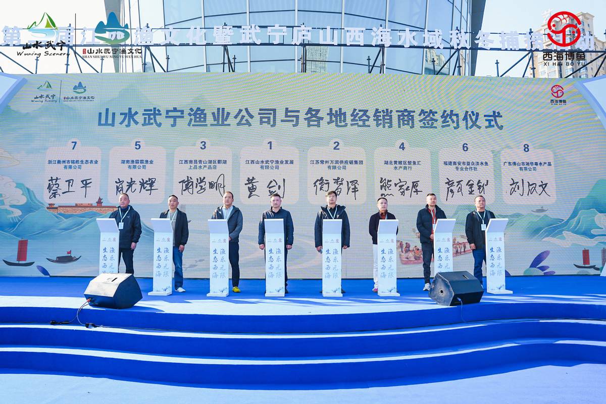 在现场,工作人员合力拉起巨大的渔网,随着"第一网"的成功出水,展示了西海丰富的渔业资源。同步进行的增殖放流活动进一步强化了湖区渔业资源的恢复和生态修复。此外,武宁县的渔业招商推介和"西海博鱼"品牌发布会也在现场举行,多项合作协议的签署为渔业全产业链发展注入了新动力。
