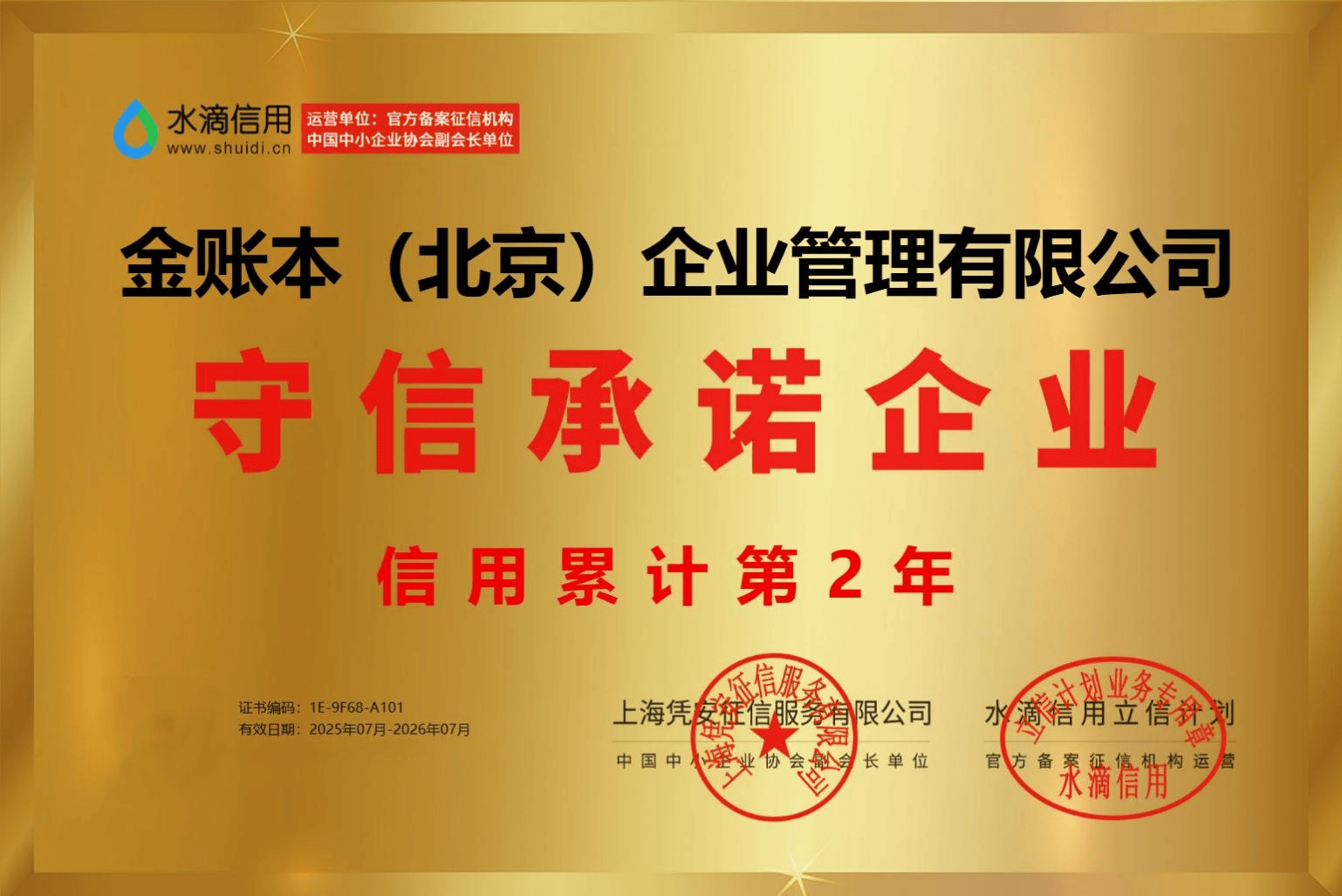 财税服务精准服务中小企业发展战略,依托企业动态经营财务数据,洞察企业健康度,守护企业生命线。成立于2019年的金账本(北京)企业管理有限公司(以下简称"金账本"),其核心团队已深耕财税领域九年以上。作为北京市朝阳区代理记账行业协会秘书长单位,金账本深知,他们托管的不仅是客户的"账本",更是企业的经营命脉与市场信誉。因此,自创立之初,他们便将"诚信"奉为不可逾越的行业生命线,以专业和信义为核心,构建起覆盖企业全生命周期的一站式财税服务体系。加入水滴信用立信计划,是金账本将这份内在的职业操守,升华为一张社会认可、客户信赖的诚信身份证的郑重宣言。